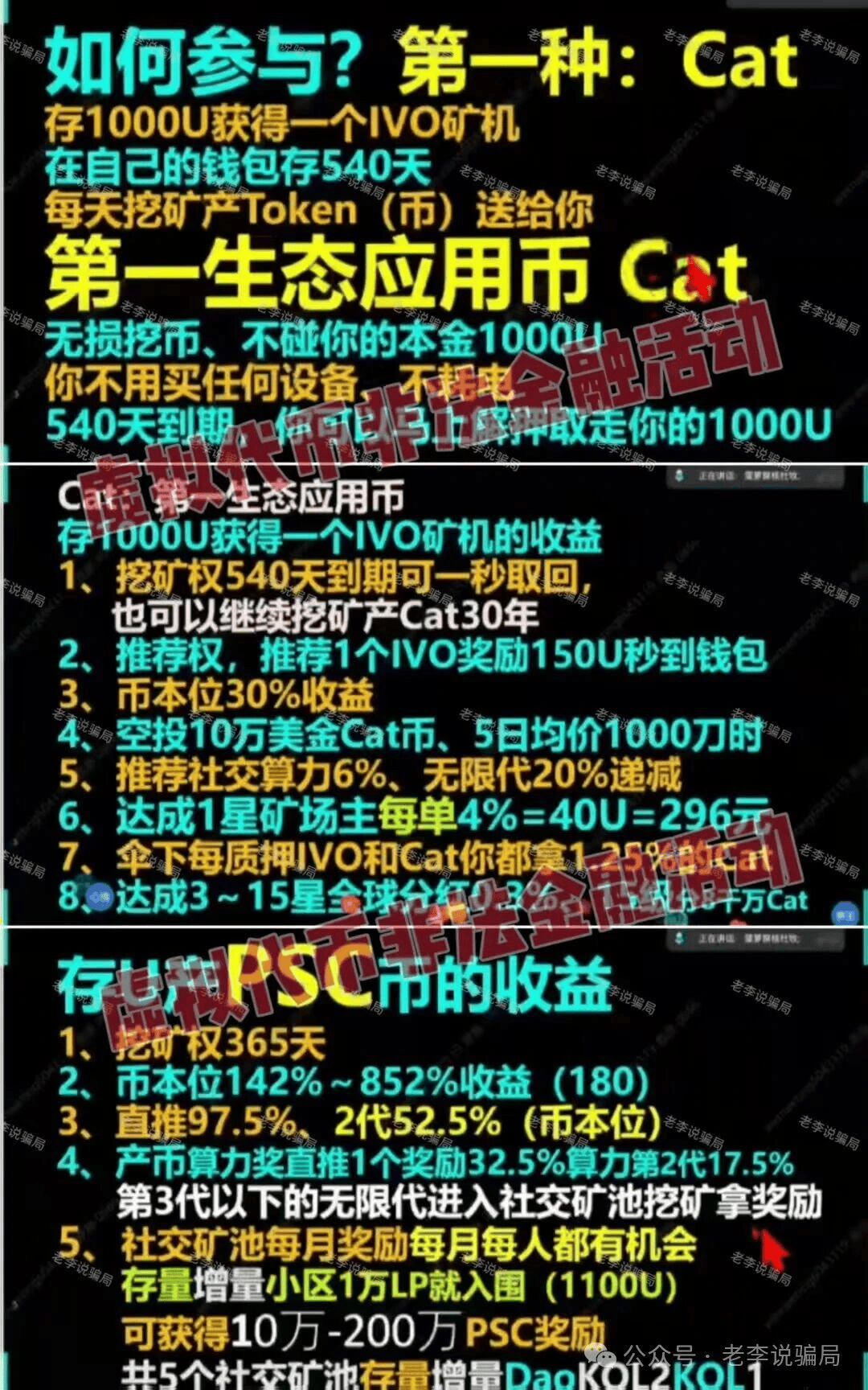 这个项目以“Web3.0与AI融合”为噱头,发行所谓的“CAT代币”,炒作“PSC”,以“质押挖矿”的形式进行虚拟货币交易,承诺高收益。