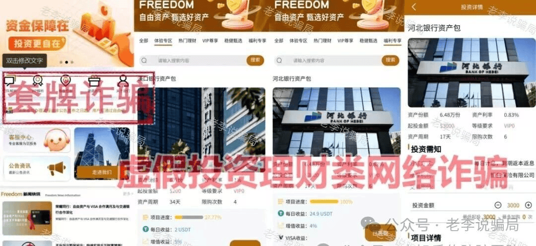 冒充境外正规资产管理公司,打着“不良资产投资”的旗号,虚构各类银行的资产包,宣称每日计息、到期保本保息,用远超正常理财的收益诱惑人投资。